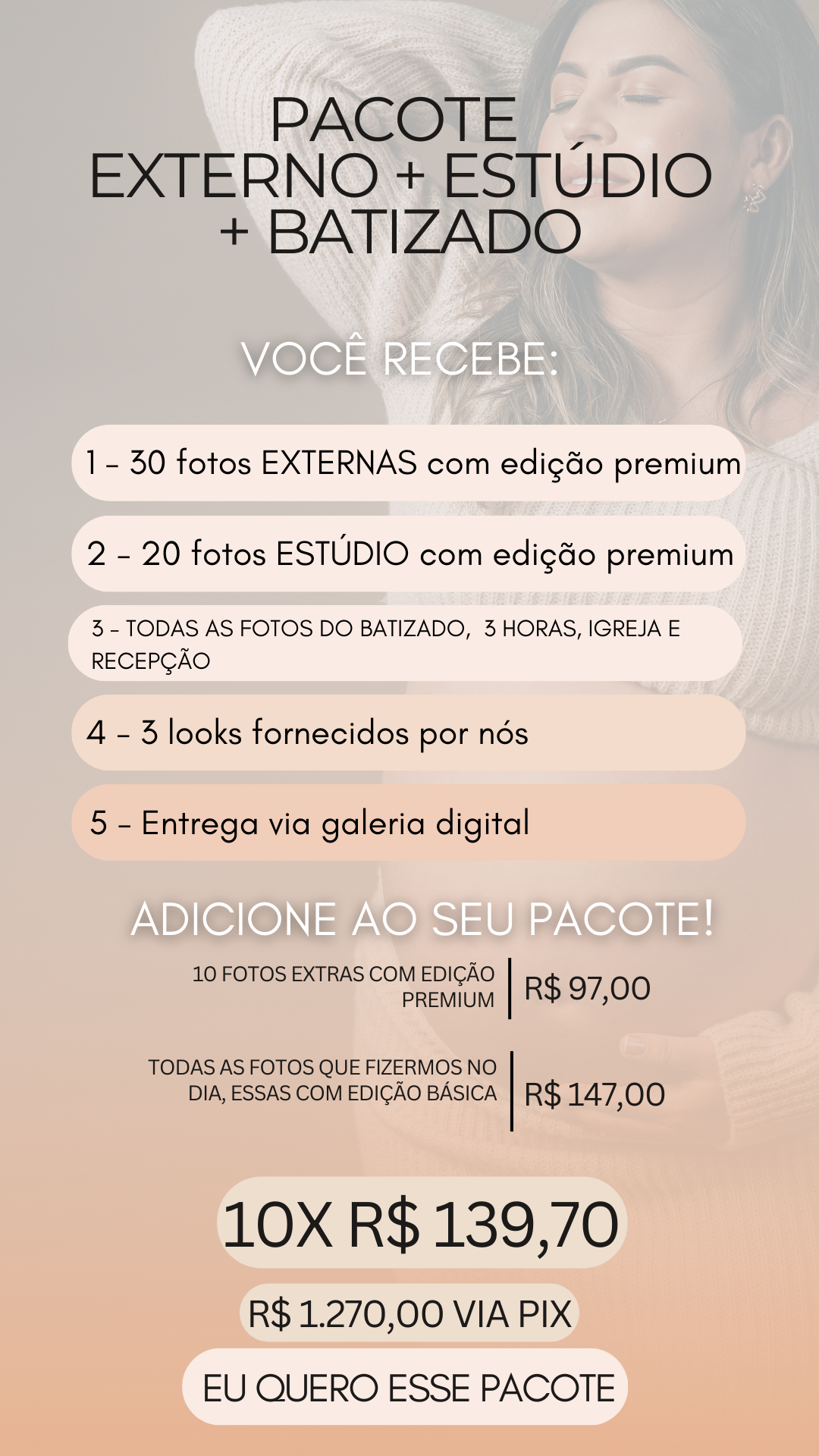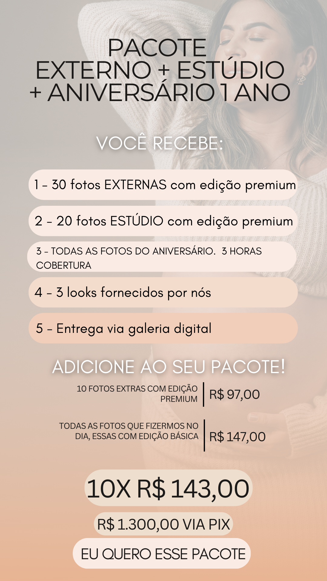 PIX: R$ 150,00 na reserva da data e o restante no dia do Ensaio, no caso de mais ensaios, o restante no dia do primeiro ensaio